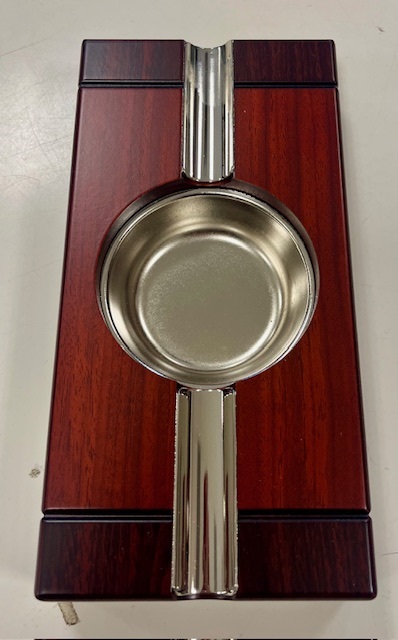 This ashtray is being sold at a discounted price due to being a showroom unit. See Pictures. For further information on this unit please call us at 954-975-2499. SD units are sold as is.This interesting two-tone high gloss cherry cigar ash tray includes a stainless steel ash reservoir and two cigar beds at an unbelievable price. Each of these cigar ash trays are felt lined so they protect your furniture. A fantastic look for the avid cigar aficionado.