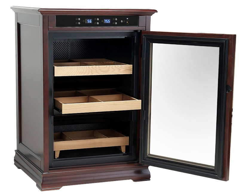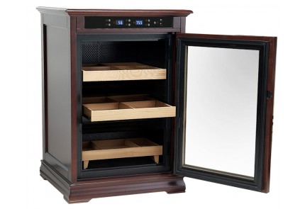 With the ability to maintain up to 700 cigars, the Royale cabinet's remarkable combination of craftsmanship and cigar preservation will impress the most particular cigar connoisseur. With its dark cherry finish, embossed side panels and crown molding detail, this unit brings luxury cigar furniture to an entirely new level. The highlight of the Royale cabinet is its electronically adjustable climate control. Ambient temperature and relative humidity and can be dialed in and monitored through its push button control panel and saved to memory. Color coded lights will alert you when the unit is engaged in heating, cooling and humidification modes. A de-mist feature that helps keep the glass free of condensation along with interior ambient lighting are also both controlled from the panel. The full-length tempered glass door produces an exceptional seal. Opening the cabinet reveals recessed door frame LED lighting (turned ON/OFF through the display panel) which illuminates the entire interior of the unit. The Royale is configured with 2 drawer style shelves. Each shelf is set on smooth metal slides and includes 3 adjustable dividers. A single removable tray sits in front of a 1/2 gallon refillable water and removable reservoir at the bottom of the interior. Shelves are adjustable and removable. Perfect for individual cigar and entire cigar box stacked storage. No maintenance - No assembly - No water lines required. Getting started with the Royale is easy. Simply plug it into any 110/120v outlet, add distilled water to the reservoir, load in your cigars, apply your temperature and humidity settings and you are ready to go! The cabinet comes full assembled in a factory sealed box. Easy start instructions and a lock and key set are included. The Royale Cabinet Humidor provides its owner with the characteristics of fine furniture that will enhance the appearance of any decor.