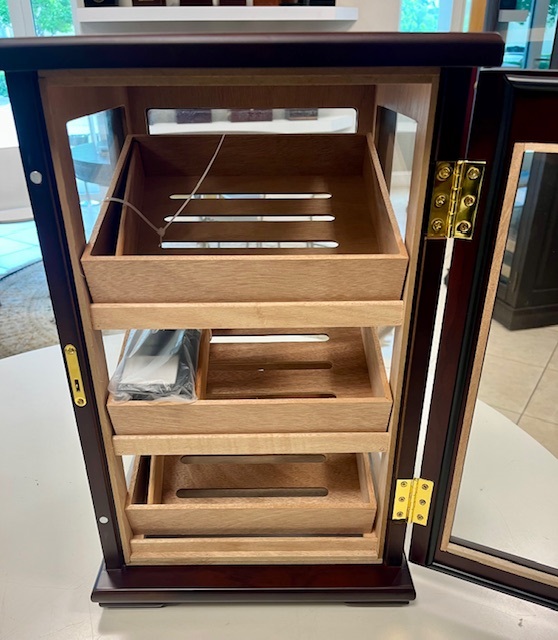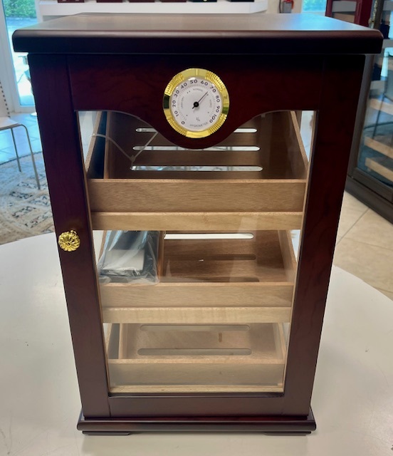 This humidor is being sold at a discounted price due to being a showroom unit, all accessories are included. See Pictures. For further information on this unit please call us at 954-975-2499. SD units are sold as is.This spacious 125 cigar capacity countertop display features 3 angled shelves with dividers and four glass sides for complete 360 degree viewing. Great for retail countertop use or for cigar connoisseurs that enjoy displaying their cigar collection. Each Milano display humidor is equipped with a lock & key set to secure its contents. Perfect for bar, nightclub, casino, retail store, convenient store or restaurant use Also includes 2 humidifiers and an external hygrometer for easy monitoring.