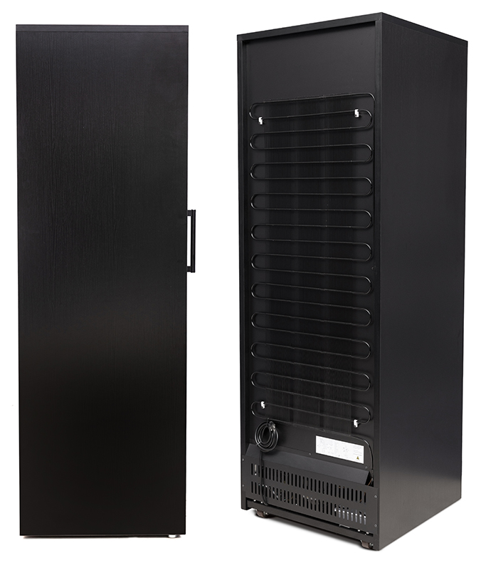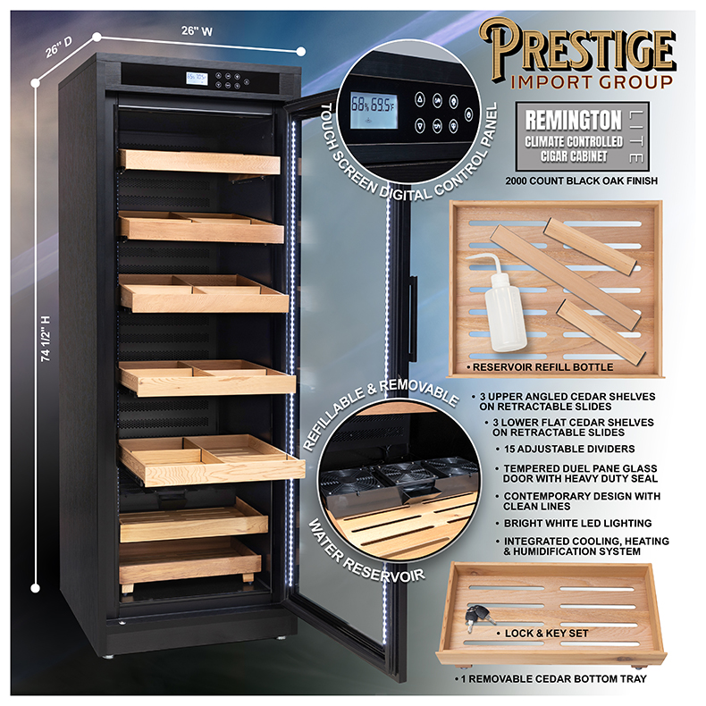 The esteemed Remington Lite cigar cabinet is the finest in electronically controlled humidors on the market today. This unit has got to be one of the most luxurious pieces of cigar furniture we have got our hands on to date. Every inch of this cabinet is done right. From its rich black oak finish to its crisp modern contemporary design, the Remington Lite cabinet humidor is a superb example of fine cabinetry craftsmanship. One of the most prominent features of this unit is its electronically adjustable climate control. Relative humidity and ambient temperature can be set and monitored through its push button control panel allowing it to maintain up to 2250 cigars. The settings are automatically saved to memory so that your smokes are always kept in the optimum environment. Built-in display panel icons illuminate indicating when the unit is engaged in heating, cooling and humidification modes. A de-mist feature that helps maintain the glass free of condensation along with pure white LED interior lighting are also both controlled from the panel. The tempered glass door possesses an exceptional heavy duty seal and a solid weight and feel. Opening the door reveals 6 drawer style shelves on metal slides for smooth operation. The top 3 shelves are set on an angle for improved viewing and the bottom 3 are set flat. Each shelf has 3 adjustable dividers. At the interior base just behind the standalone tray there is a ledge that holds a removable 1/2 gallon refillable water reservoir with a built-in auxiliary fan that provides moisture to the entire cabinet. The water reservoir can also be re-located and set into a slotted recess in the lowest sliding tray for easy access. Each sliding shelf is adjustable and removable. Accommodates individual cigar and entire cigar box storage. No maintenance - No assembly - No water lines required. Simply plug the Remington Lite into any 110/120v outlet, fill the water reservoir through the fill spout, load in your cigars, adjust your climate settings and you are ready to go! The cabinet comes full assembled in a factory sealed box. Easy start instructions and a lock and key set are included. The Remington Lite Cabinet Humidor provides the cigar aficionado with the ultimate in cigar preservation at an amazing price! (220/240v option available, please contact us for lead time and shipping quote)Holds Up To 2250 Cigars